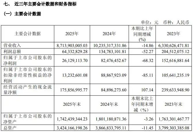 曾经的跨境物流“黑马”海程邦达(603836.SH)4月17日晚披露2025年年报,公司去年营业收入87.14亿元,同比下降14.86%;归母净利润为2612.91万元,同比暴跌68.32%;扣非归母净利润更是同比锐减85.11%至1323.26万元。